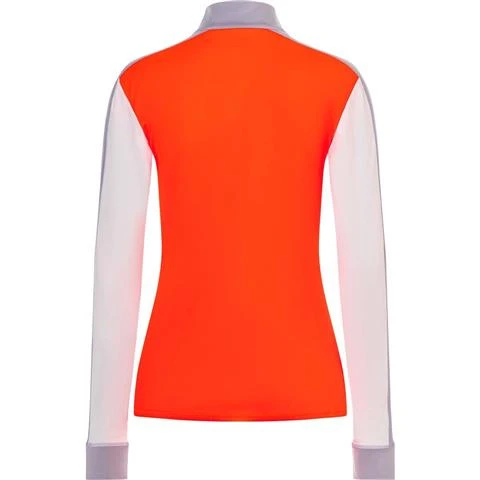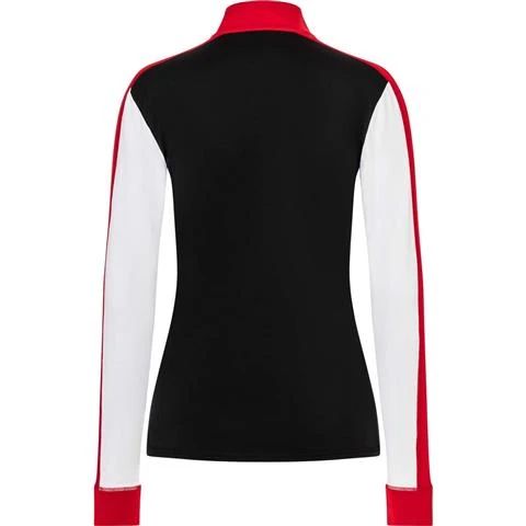 Quick dry first layer with stripe color block for sleeves and shoulders. Glossy logo print at lower left sleeve.