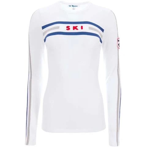 Retro and racy, the Ski sweater is a sleek and fun layering piece for your mountain adventures. Made from a stretchy Rayon + Nylon blend yarn, this lightweight crewneck sweater feels smooth and form-fitting on the body. Meister label.