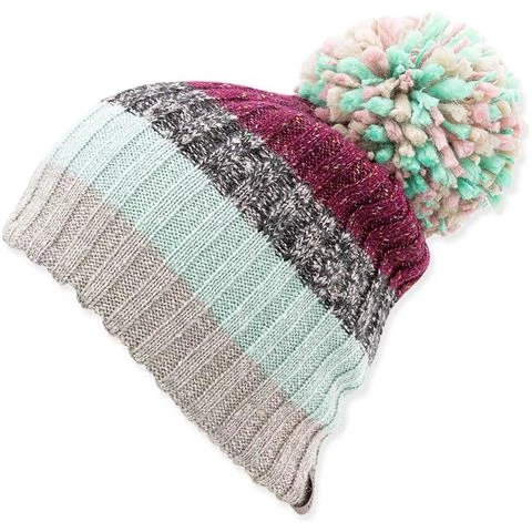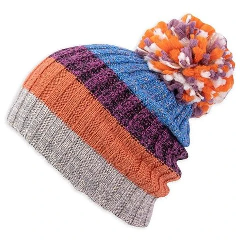 Wide rib-knit with fun bold stripe pattern, large multicolored pom